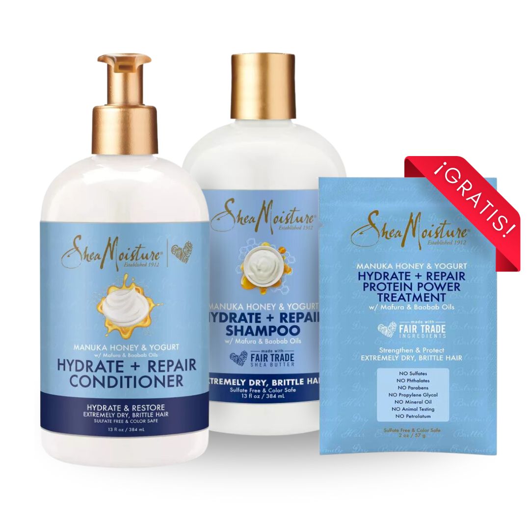 🍯El pack Manuka Honey & Yogurt de Shea Moisture se centra en la hidratación profunda del cabello, utilizando la miel de Manuka y el yogur natural para reparar y fortalecer el cabello dañado y reseco.